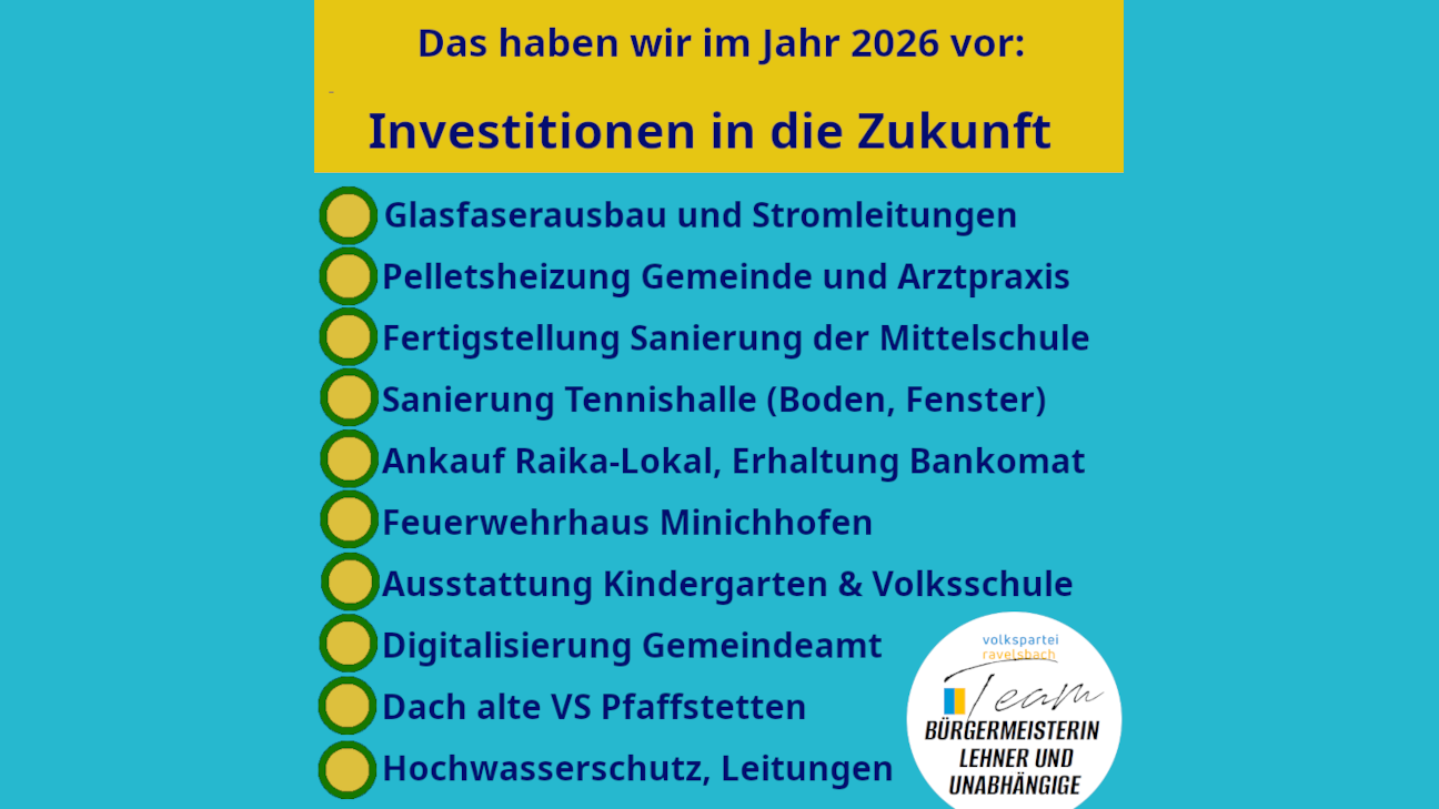 Es wird weiter in den Hochwasserschutz investiert. Weitere Investitionen betreffen die Wasser- und Abwasserleitungen. Für diese Leitungen werden die Vermessungen und Sichtungen für den elektronischen Plan (Leitungskataster) fortgesetzt. Dieser Leitungskataster ist auch die Grundlage für künftige Förderungen im Bereich der Wasser- und Abwasserleitungen.