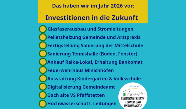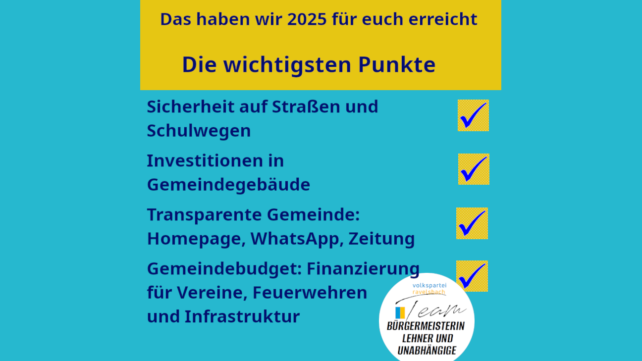 Wir danken allen Ravelsbacherinnen und Ravelsbachern für ihr Vertrauen im vergangenen Jahr und möchten versichern, dass wir auch in Zukunft verantwortungsvoll mit den Ressourcen unserer Gemeinde umgehen werden, damit Ravelsbach künftig noch lebenswerter wird.